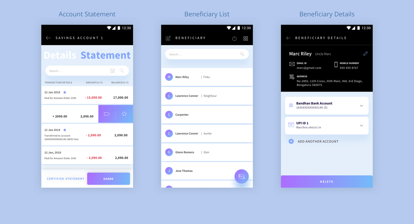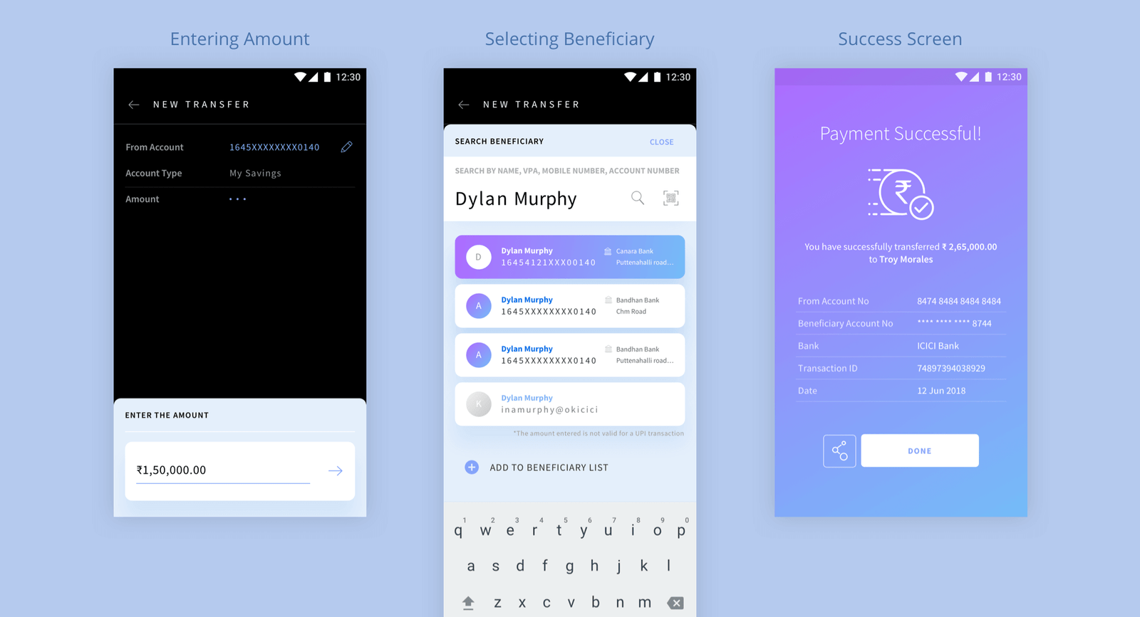Imagine having to create multiple beneficiaries for one person and then having to remember all of them without any confusion. After a lot of brainstorming, we decided to treat beneficiaries like contacts from our contact book. Users can create a parent beneficiary and then add different modes under each one. This allowed users to add multiple modes of payment under one beneficiary without having to enter the parent details all over again.