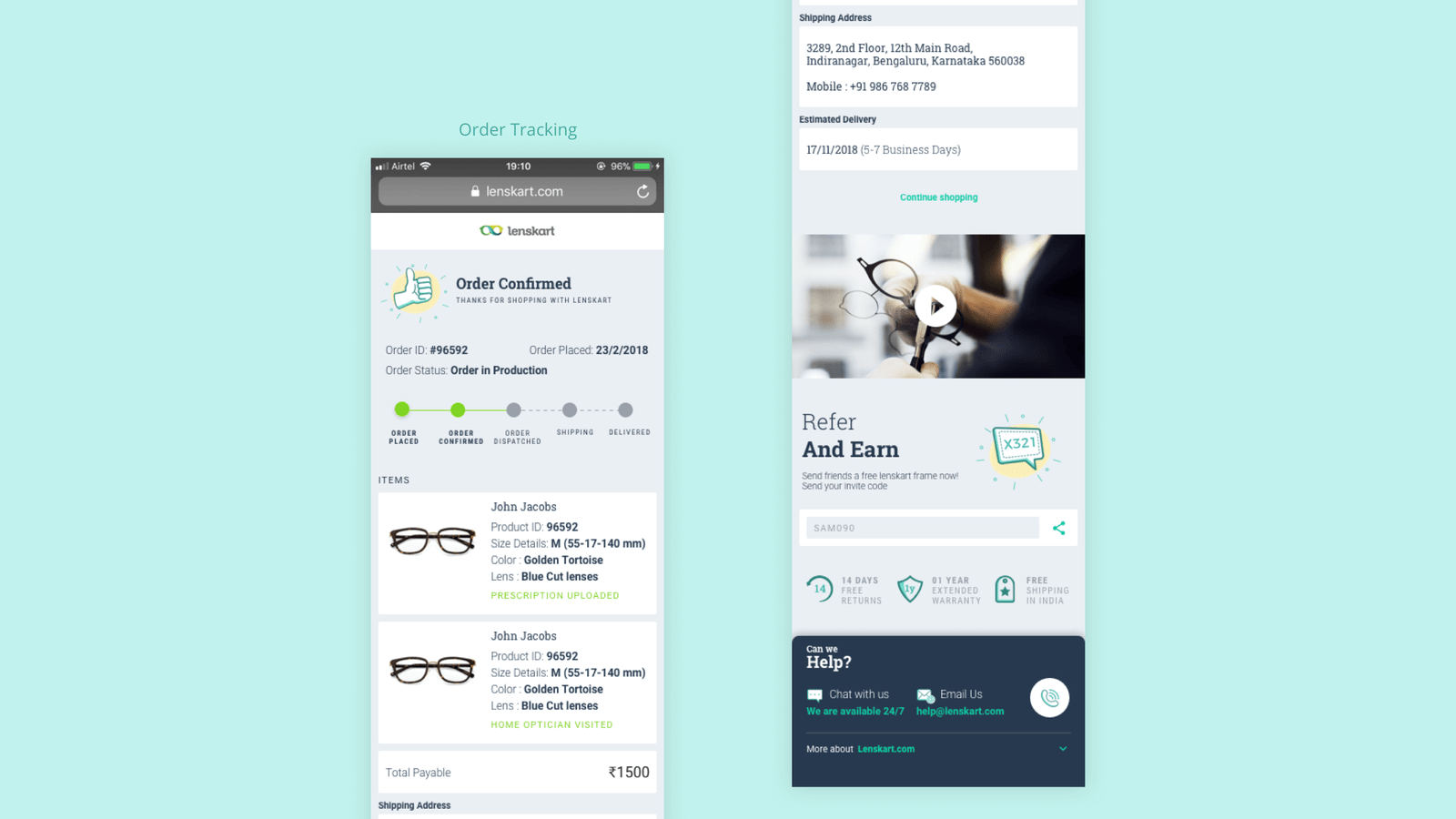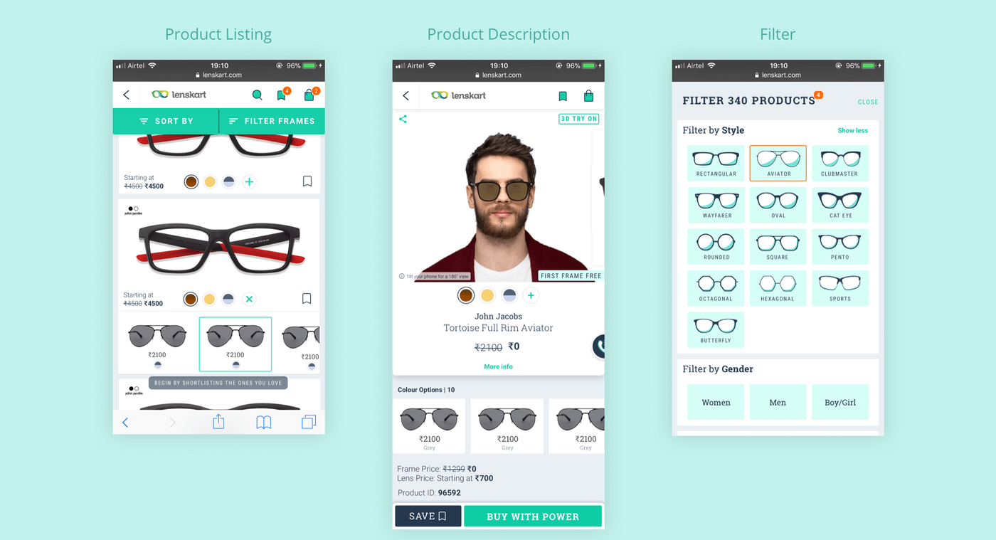 Our challenge was to design a mobile e-commerce site that would help in better conversion and work seamlessly with Lenskart’s offline stores and processes. The client had also worked with other UX agencies before working with us and had not been able to achieve the goals that they had set out to achieve. They had, therefore, proposed some key performance indicators (KPI’s) as goals for us to achieve and required us to guarantee them.