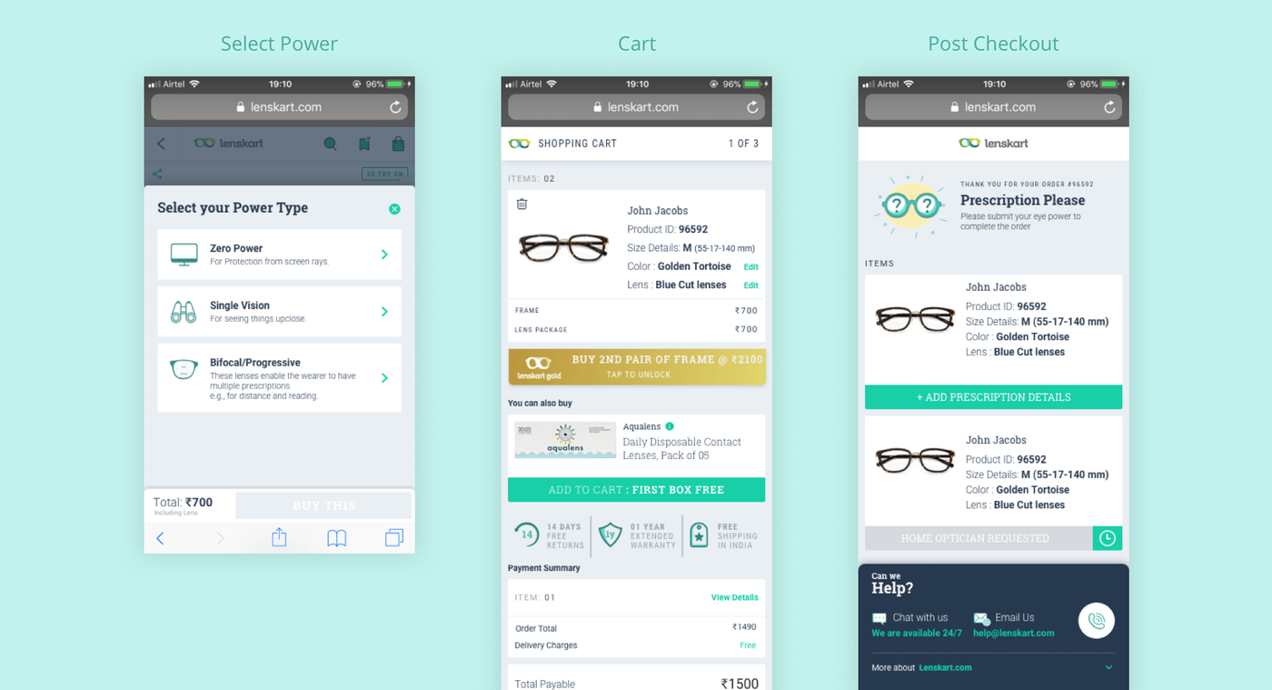 We worked very closely with the Lenskart team to identify the problems and recognise the user’s needs. This meant studying their research documents and examining their website analytics very closely. We then designed user journeys that didn’t repeat these problems while simultaneously addressing the needs of each type of user.
